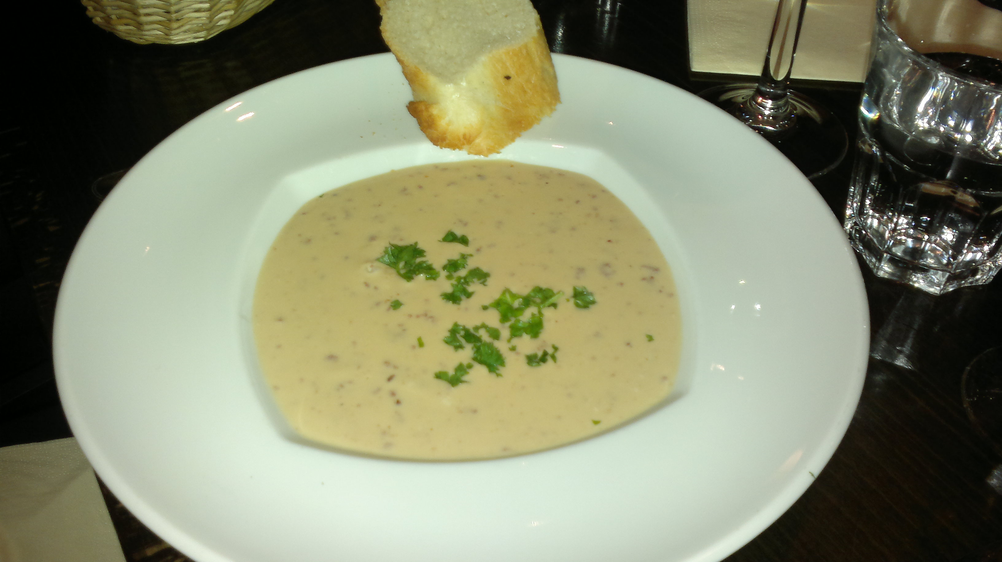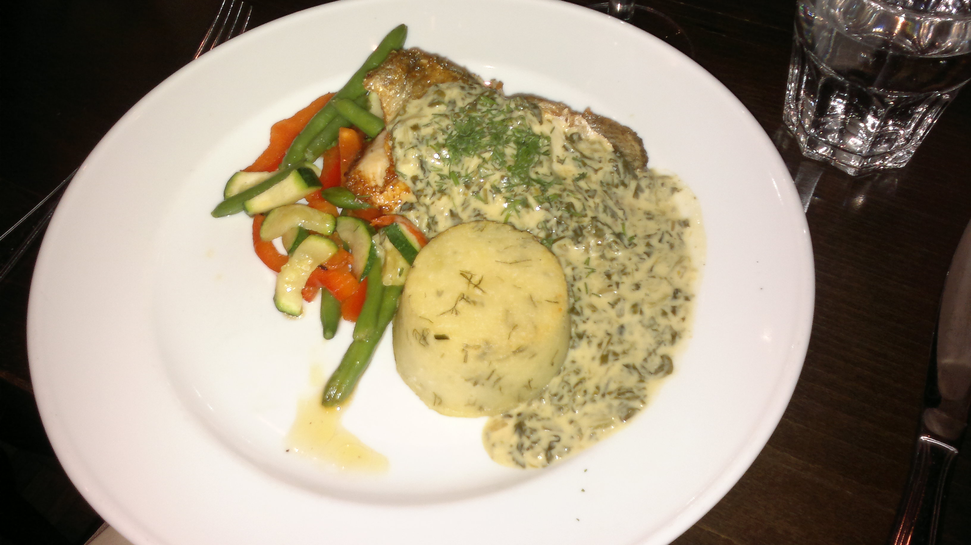 For main courses we ate i.a. smoked salmon with fungus sauce (in the picture), grilled white fish with spinach sauce (in the picture), roasted corn chicken with rosemary-red wine sauce and garlic potatoes, Coeur de fillet – whole roasted fillet of beef with Cafe de Paris herb butter and garlic potatoes and traditional pepper steak fillet from the house with country potatoes. Portions were not as “attractive” as starters but basically OK. Some hassle with white fish as potatoes were not ordered ones, but steward noticed it before us. If main courses would have been at the same level as starters, restaurant would have received 4 as a grade for food.