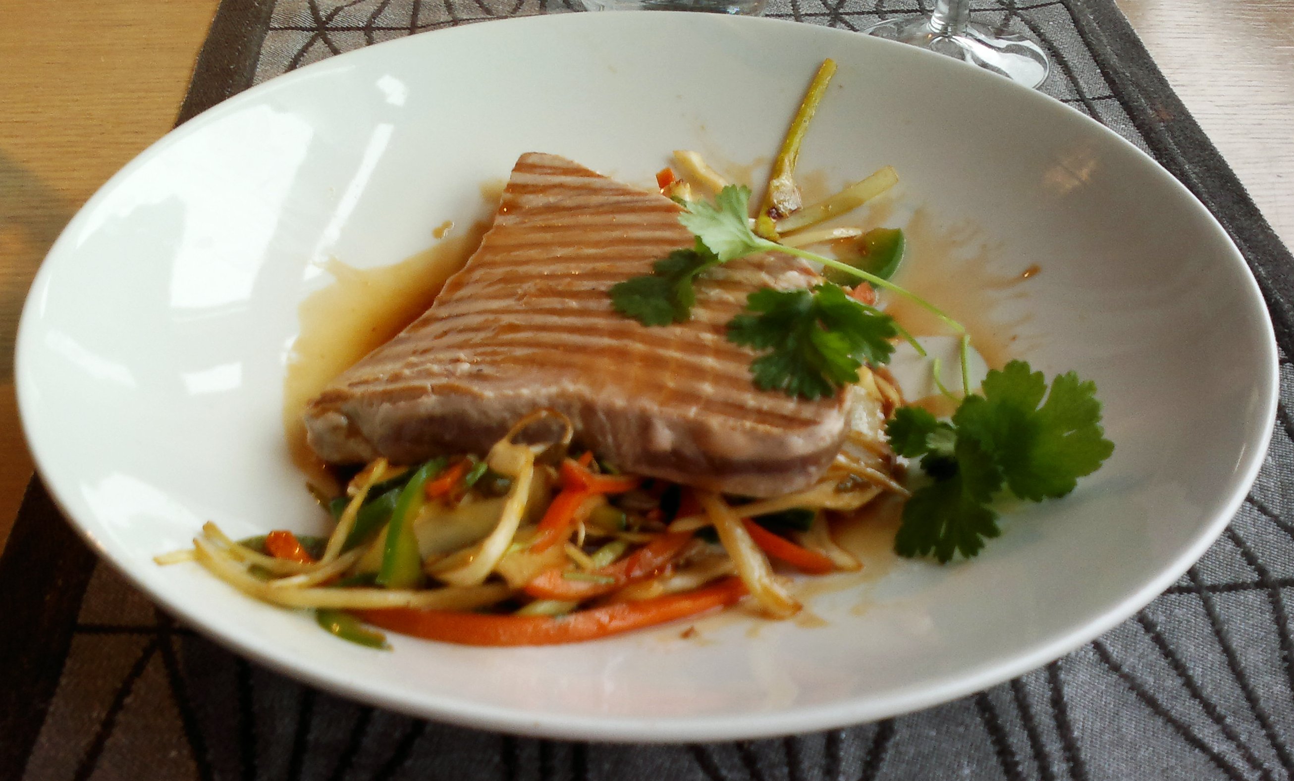 For main course ordered Grilled tuna fish, vegetables and wasabi-teriyaki sauce and Grilled chicken, red wine sauce and potato wedges. Tuna fish was ordered as medium but is was anyway a little bit chewy. Sauce with vegetables was best part of this portion. We have tried grilled chicken with various choises several times and it is always enjoyable. Can recommend e.g. pepper sauce with french fries also.