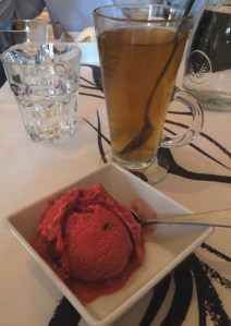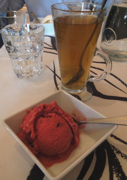 Because main courses were so generous decided to taste ice creams with tea and espresso. Home made Rasberry sorbet and Baileys ice cream ended the dinner appropriately. Next time have to try Mud cake because usually it “separates wheat from the chaff” when it comes to competence of the kitchen.