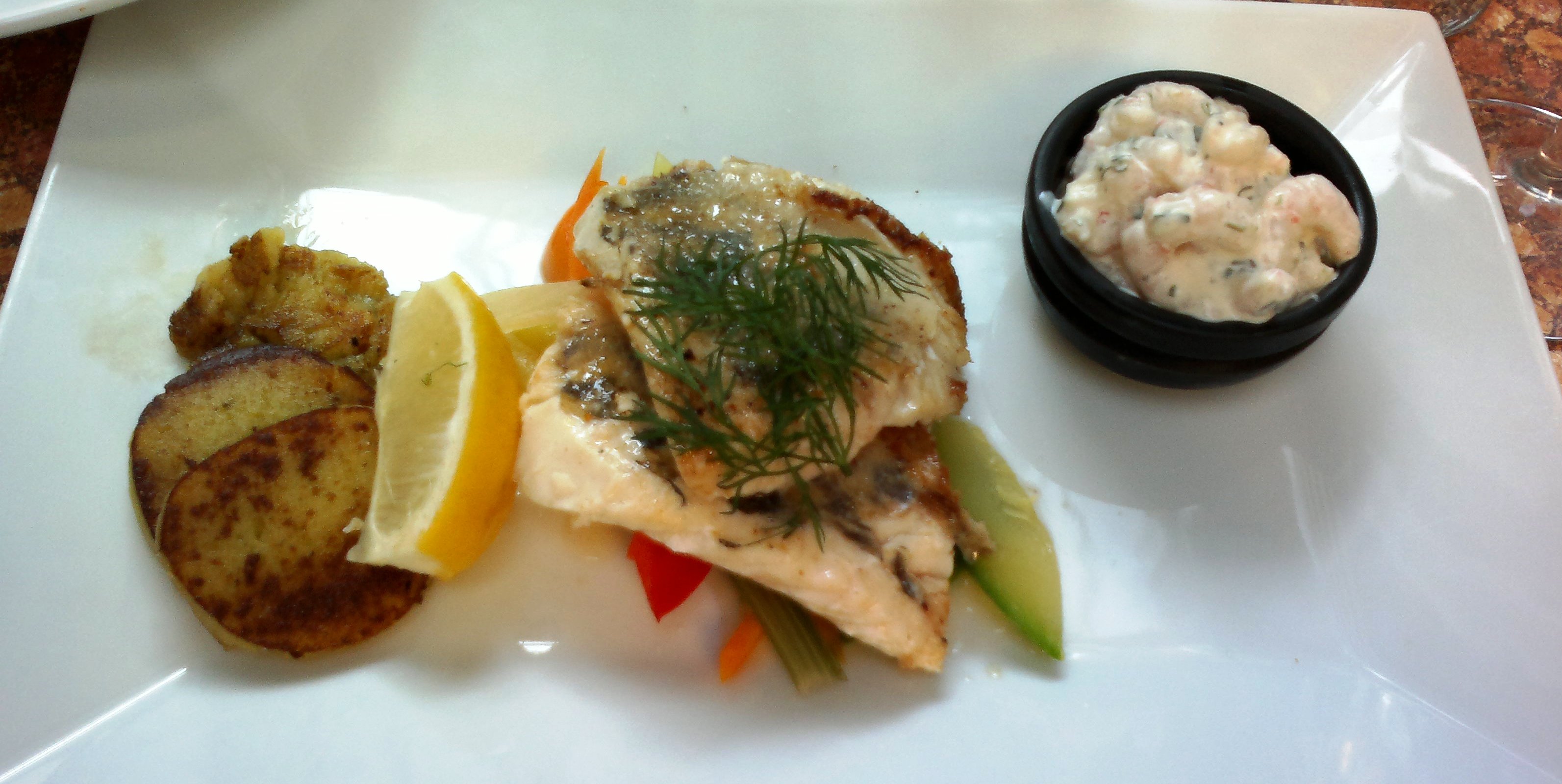 Restaurant suggested to order Pike perch in August which we did. Fish came with steamed vegetables, potato cakes and shrimp remoulade. Wondered if chef had used white pepper instead of salt. Had to also add salt which is really rare for us. Also ordered Surf & Turf Fried chicken breast fillet, jumbo shrimp skewer, coconut-citrus sauce and creamy white wine risotto. Chicken and shrimps were ok but risotto was more or less like porridge. For side dish ordered Mixed salad which balanced main courses well.