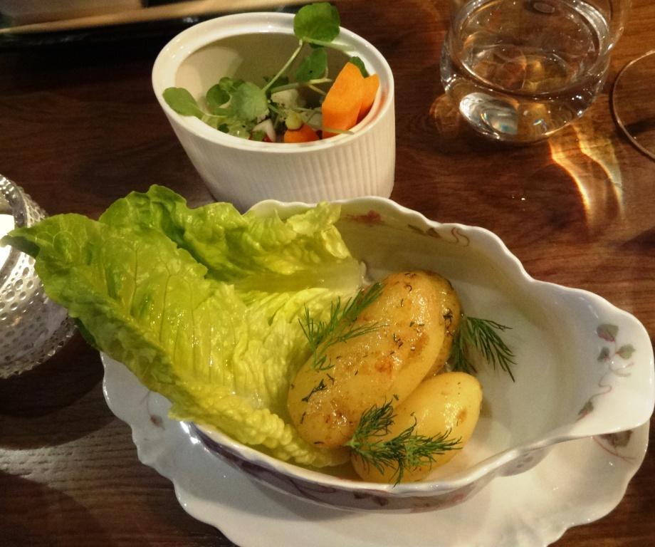 For starters decided to try 4 different portions: ”BAGNA GAUDA” Tarragon & watercress dip w/ season’s vegetables à la Master Ducasse…, ”POP CORN” Seaweed & chicken skin served with sesame, soy & truffle sour cream, SPICY CHICKEN WINGS (HV´S CHICKEN BASKET) Served glazed with kimchi mayonnaise. “Sticky fingers…” and NEW POTATOES WITH HAUGESUND HERRING New potatoes, dill butter & herring caviar.