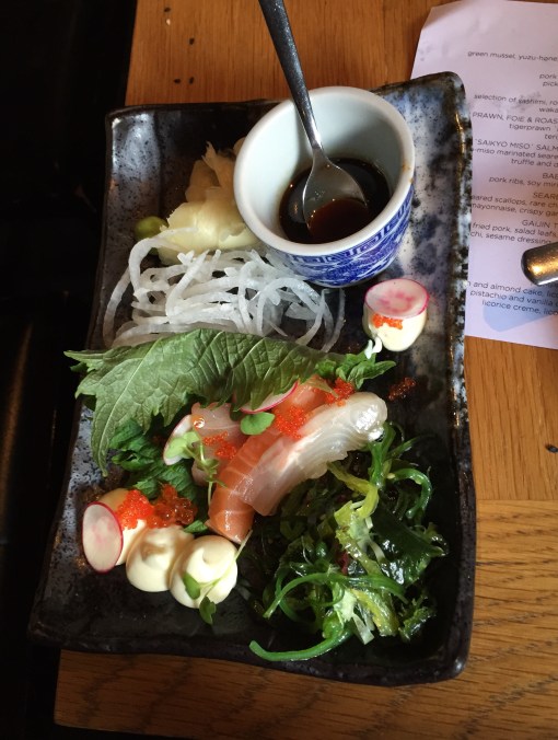 selection of sashimi, roe, wasabi-yuzu dressing, wakami, wasabi mayonnese