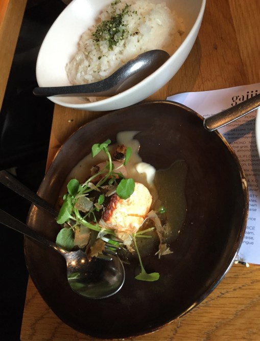 ‘saikyo’-miso marinated salmon, cauliflower, truffle, dashi emulsion, bonito