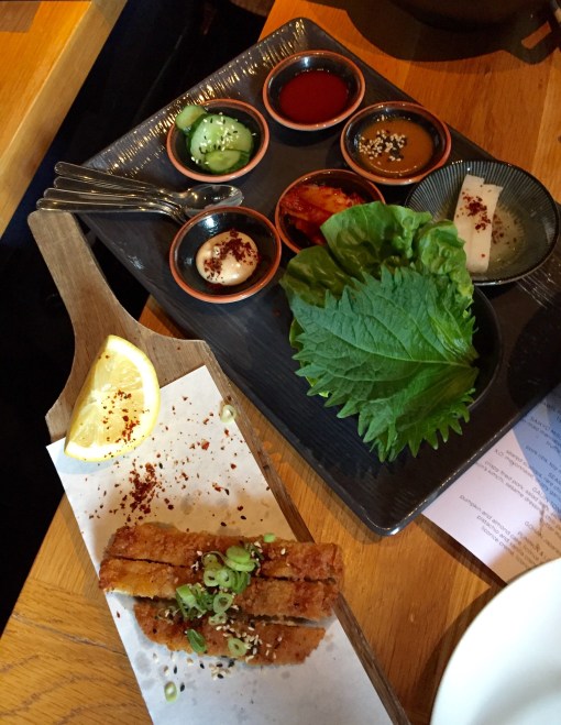 grispy fried pork, salad leafs, Japanese pickles, Gaijin’s kimchi, sesame dressing, chilli paste, brown butter mayonnese