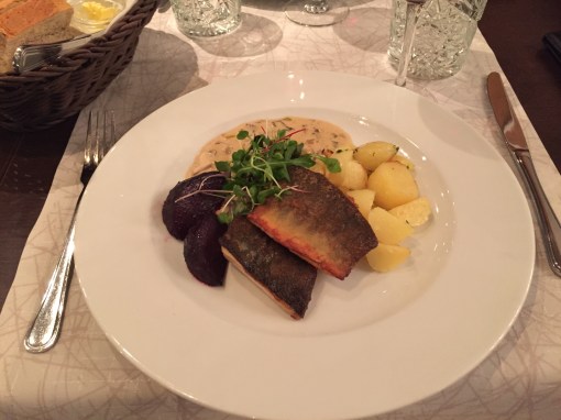 Fish of the day was Arctic char, which is cold-water fish in the family of salmonidaes. Quite common in Finland. Side dishes were beetroot, potatoes and mushroom sauce. Simple, tasty but fish pieces could have been bigger.