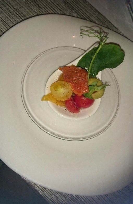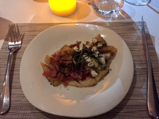 Dinner starts with appetizers, restaurant served Foccacia with parma ham and mozzarella and as vegan version 3 different kinds of cherry tomatoes, olives served with the house vinagrette.