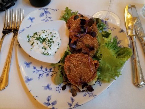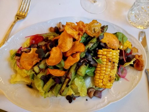 Vegan starter was GREEN TOMATOES Fresh salad and Louisiana remoulade and standard CAROLINA CRABCAKE & OKRA SALAD Romesco paste, lemon curd.