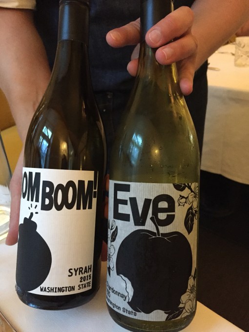 Both wines come from Charles Smith Wines. Boom Boom Syrah for meat and Eve Chardonnay for vegan dish. Waitress actually chose white wine as it paired better with asparagus and other veggies.