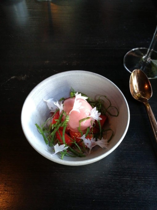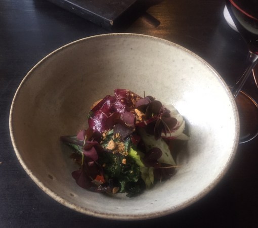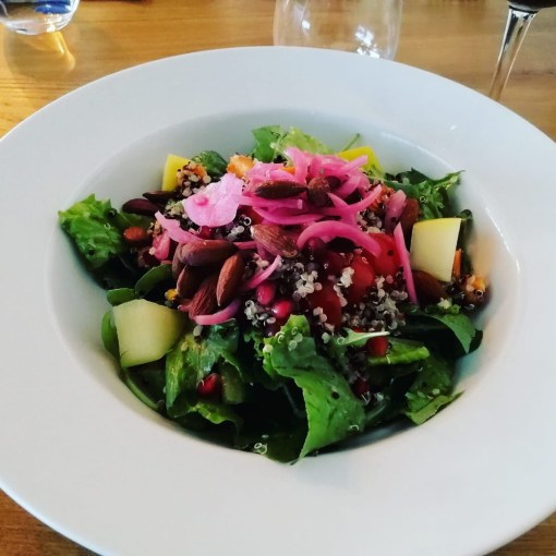 Started the dinner with Salmon ceviche with yoghurt and rye chips and half portion of Pomegranate-quinoa salad, pomegranate seeds, roasted sweet potato, almonds & apple cubes.