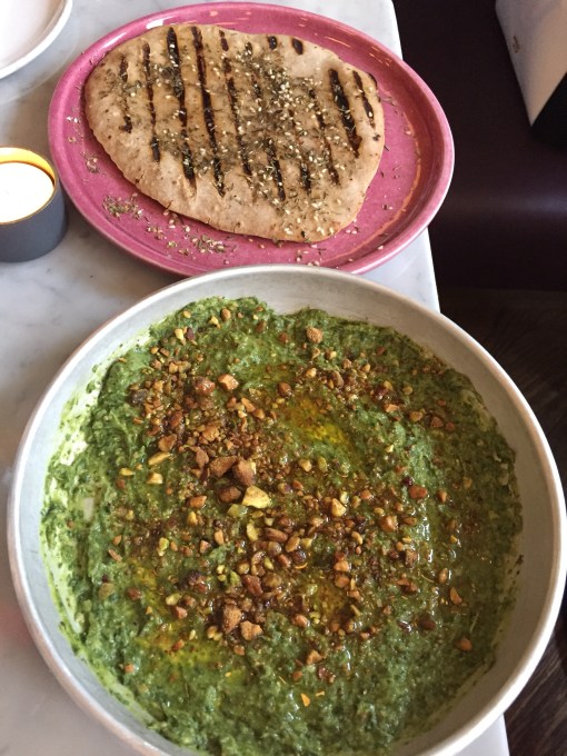 First we got vegan flatbread and dip which included avocado, pistachio and thai basil. Parmesan was left out in vegan version but is was not actually needed. Combination was delicious. Ordered later on “normal” flatbread to accompany so called main course and it was really tasty.