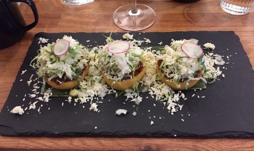 For starters ordered Guacamole Made daily with fresh avocados, tomato, onion, coriander, chile & lime. Served with traditional totopos, Sopesitos 3 small hand made corn sopesitos, topped with smashed beans & chorizo, crème fraiche, lettuce & queso fresco and Yaca Pibil Panuchos From Yucatán 3 small corn panuchos, topped with smashed beans, jack fruit pibil, pickled habanero & onios