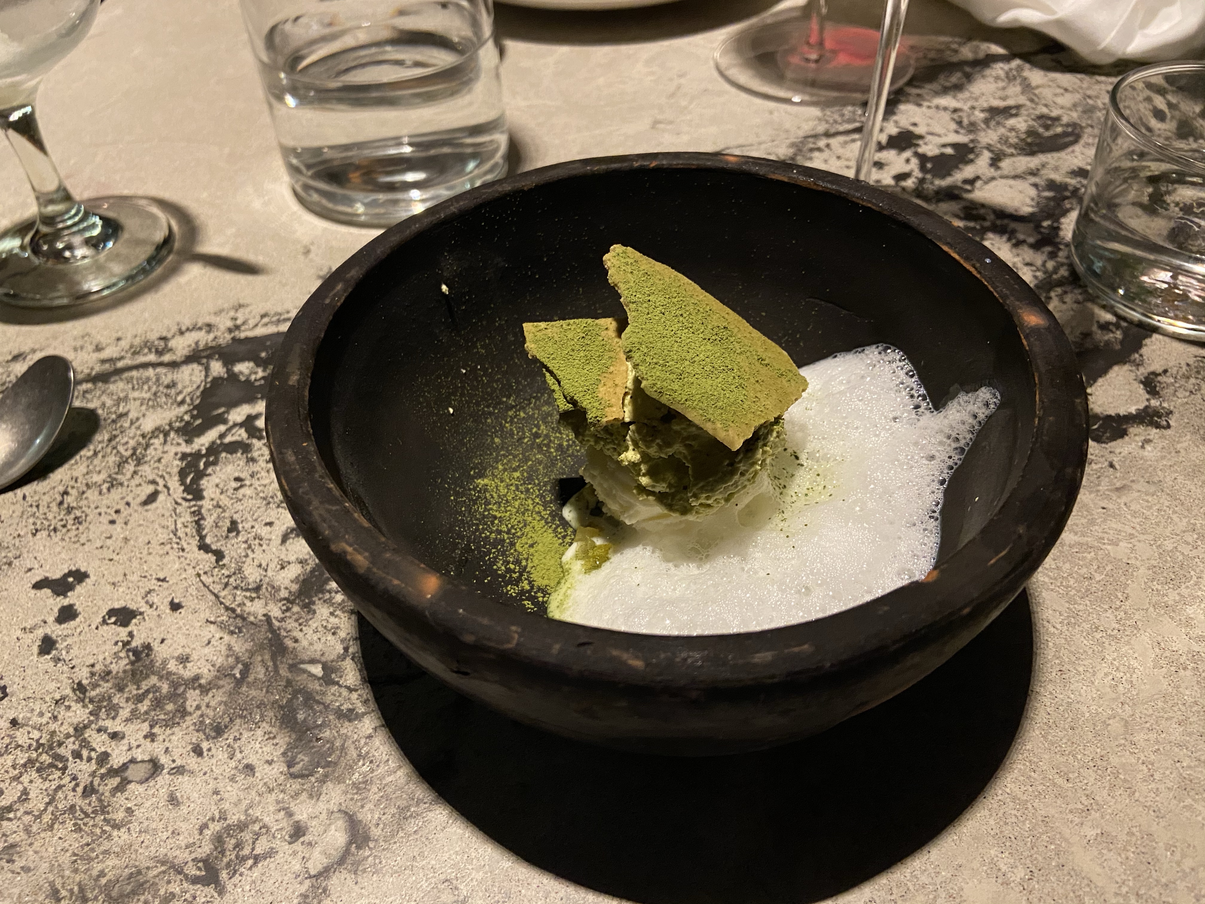 Dessert was also “light”, luckily, Currant leaf parfait, lemon curd seasoned with gin and juniper meringue. Parfait was close to creamy ice-cream, very tasty. And meringue complemented well providing perfect end for the dinner.
