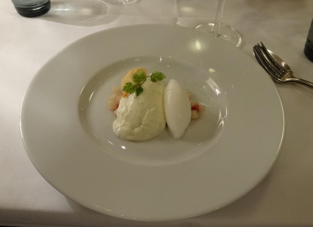 All three snacks were enjoyable. Hoped that mousse would incude some pieces of pike, but it was pure mousse with taste of pike. Salmon is always delicious but could not find any taste of soy in this case, maybe forgotten. Combination of small scallops and crayfish on cockleshell tasted good.