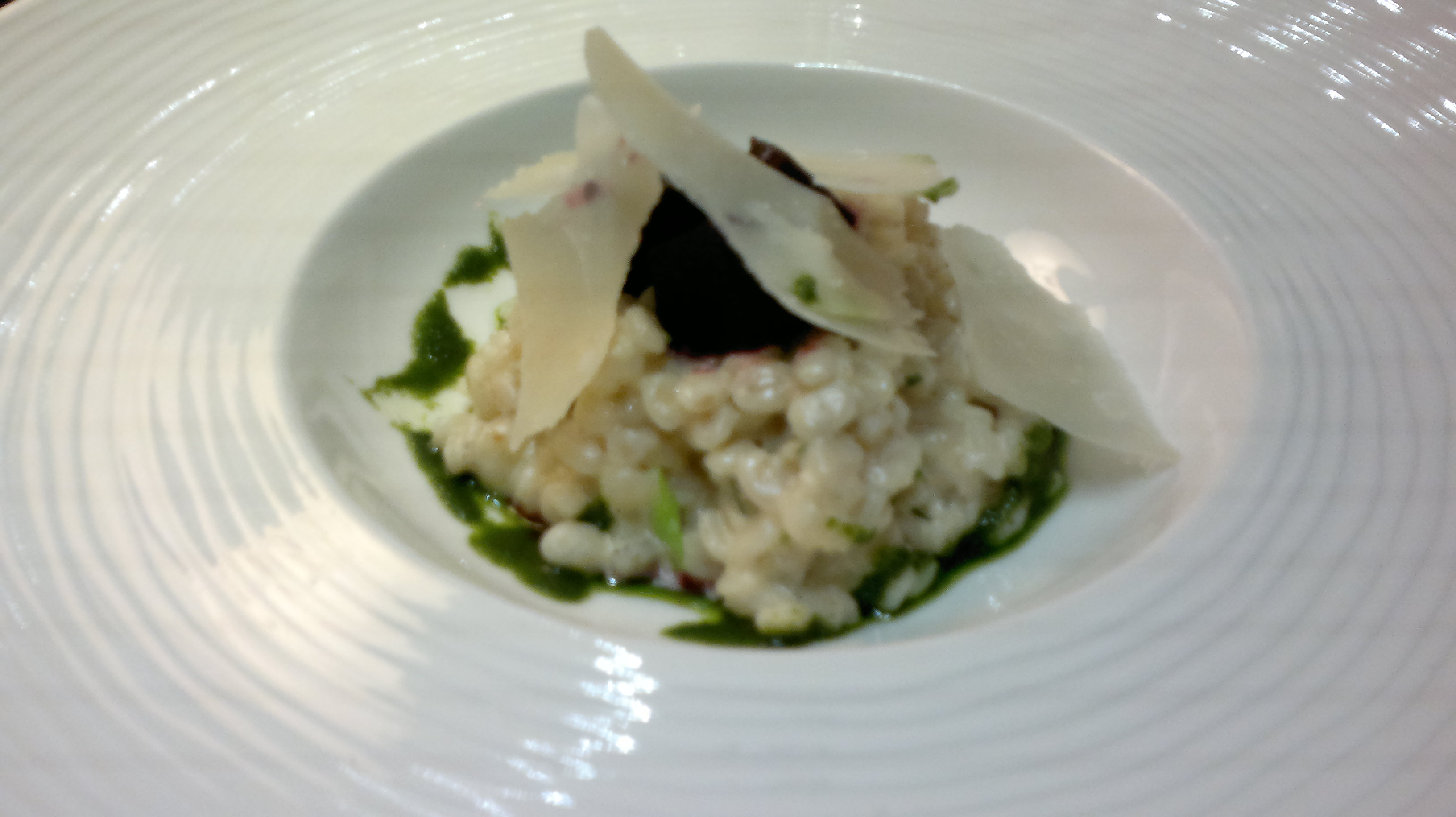 For main courses ordered Grilled prawns served with risotto of sun dried tomatoes, parmesan cheese and sauvignon blanc with deep fried leak and Grilled sea bass served with truffle oiled green asparagus, jerusalem artichoke purée and salad of seedlings, herbs and pine seeds