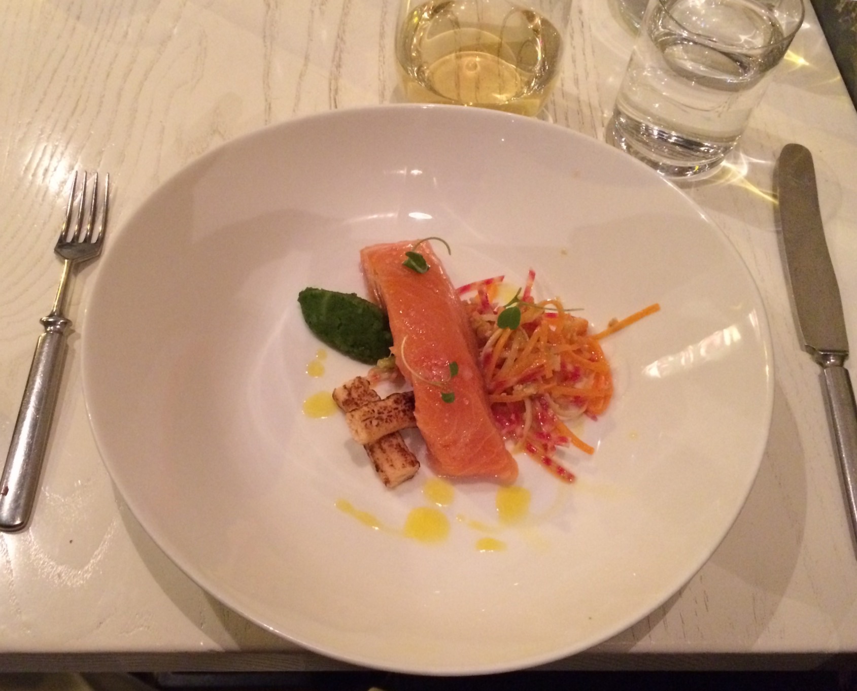 First warm main course was salmon with root salad. Salmon was almost raw, but it was not at the same time. It had been cooked or steamed at 42C degrees, which made it soft. Spoon would have been enough to take care of it.