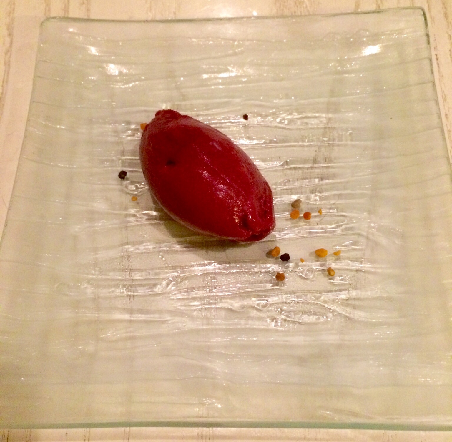 Intermediate dessert consisted of Västerbotten cheese sorbet and Blackcurrant sorbet, which did not include milk products. Västerbotten cheese is famous Swedish cheese, which suits well for main courses but suits in this case for dessert as well.